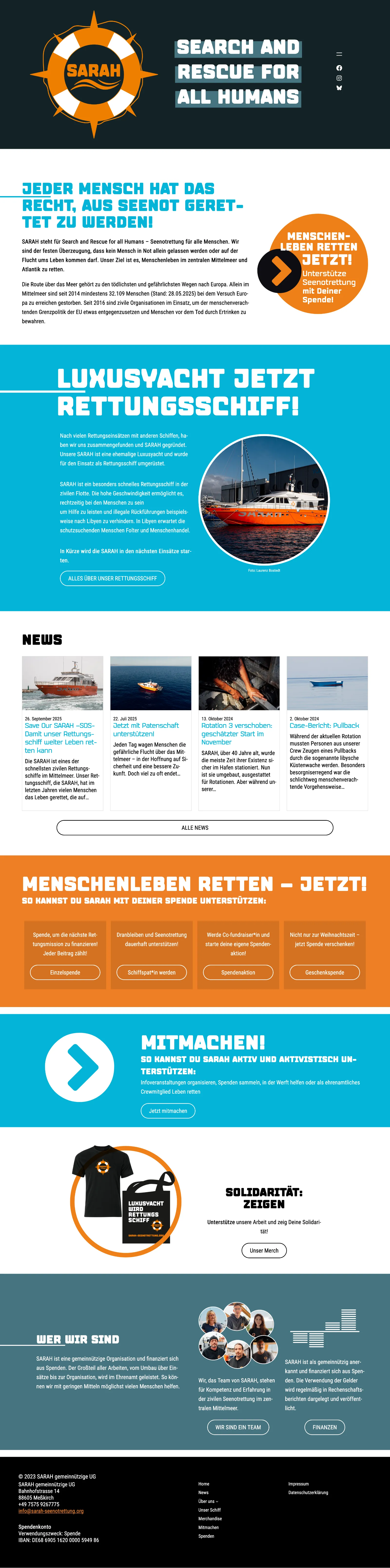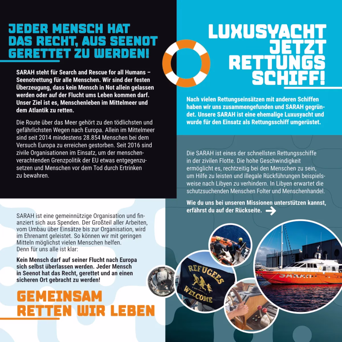 SARAH steht für Search and Rescue for all Humans – Seenotrettung für alle Menschen – in der festen Überzeugung, dass kein Mensch in Not allein gelassen werden oder auf der Flucht ums Leben kommen darf. Das Ziel ist es, Menschenleben im Mittelmeer und dem Atlantik zu retten.